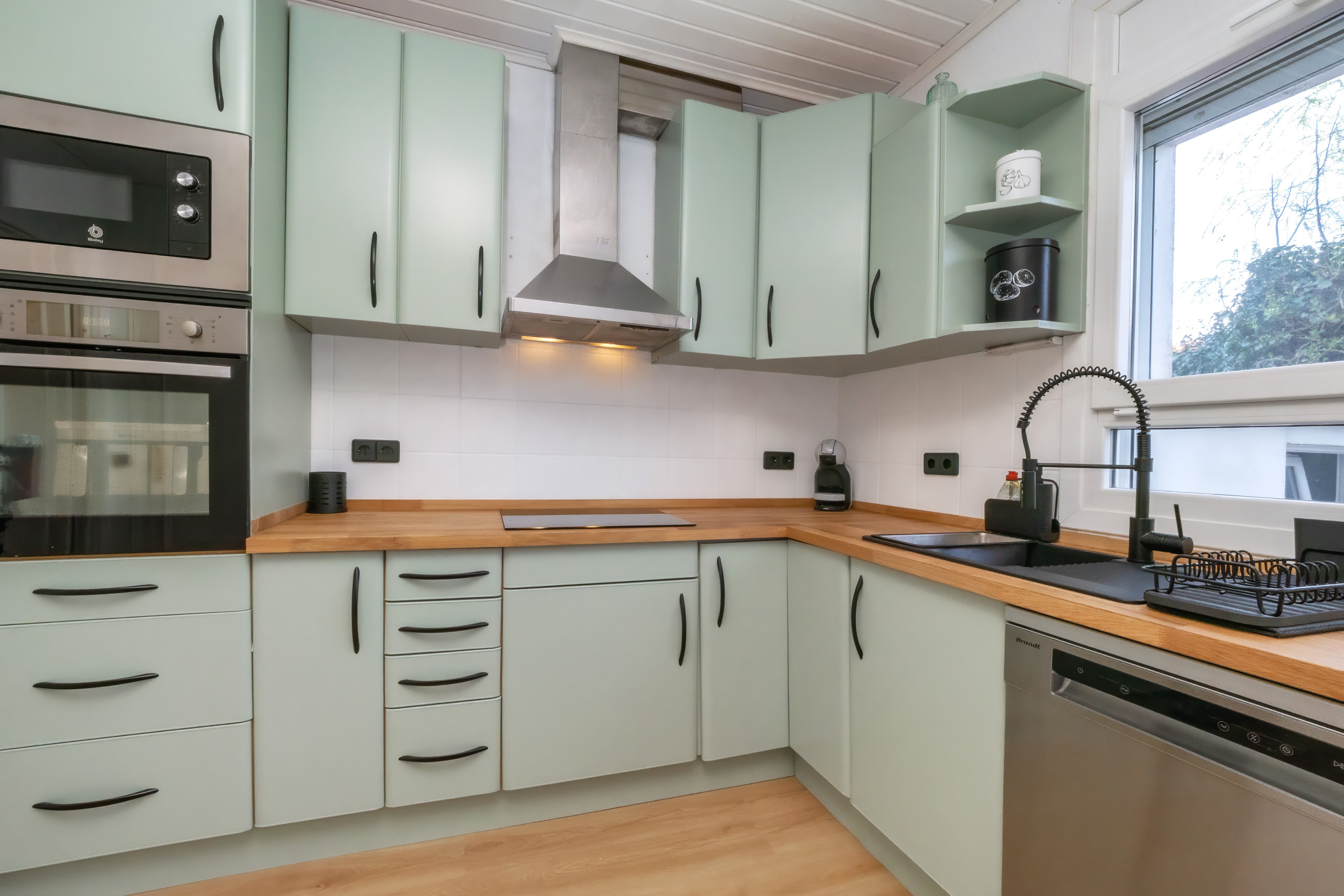 La cuisine est équipée avec réfrigérateur, micro-ondes, four, congélateur, lave-vaisselle, ustensiles de cuisine, cafetière, grille pain et bouilloire.