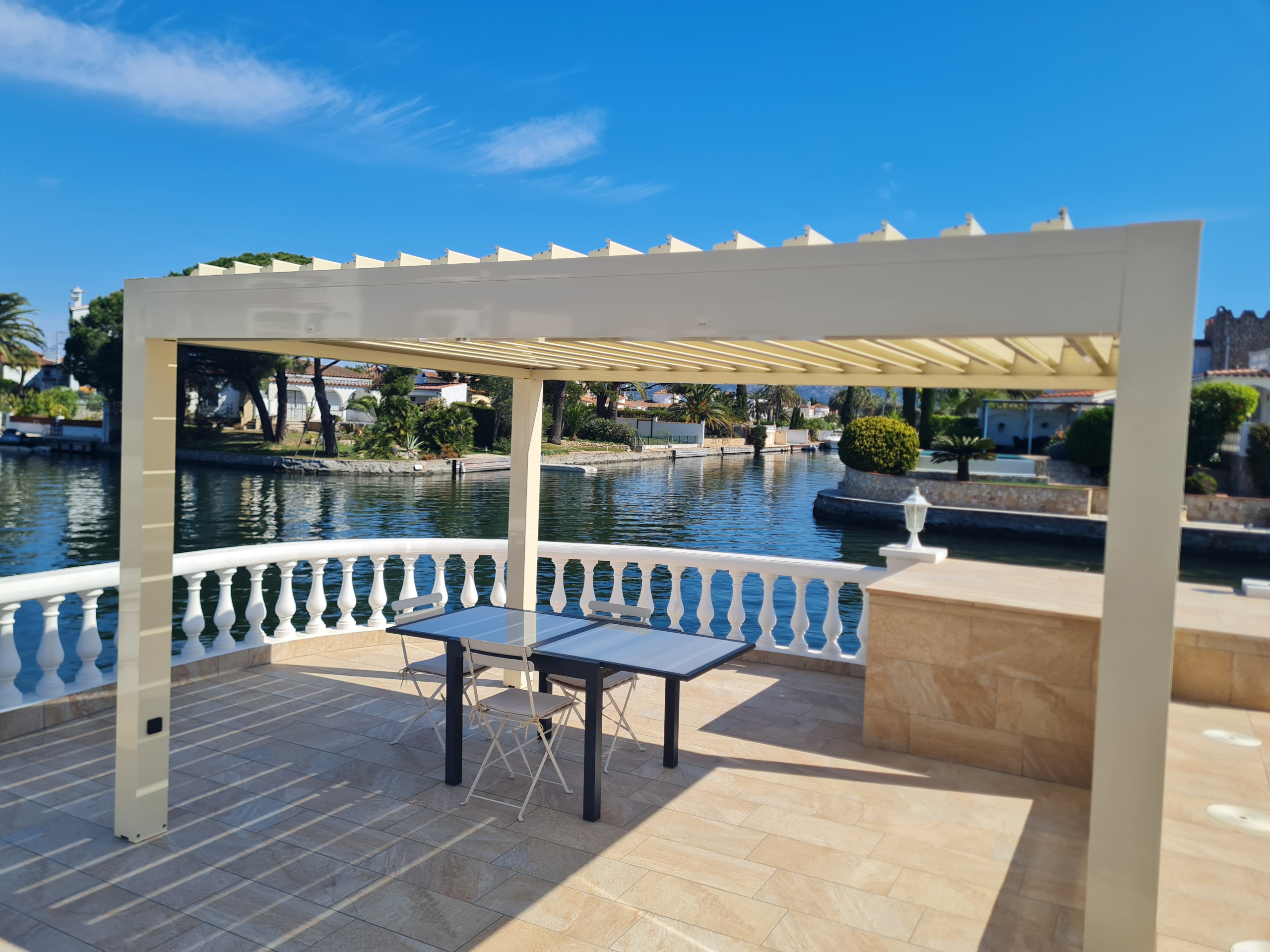 La maison à une trés belle vue sur la marina, le jardin ,et, la piscine,pergolas,banc en dur et coussins d'assise,borne de recharge électrique pour voiture.